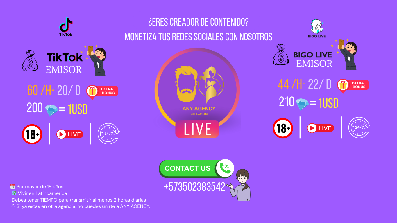 @Eliwagnerugc Gracias a Any agency comencé en el mundo de los lives. Me han brindado apoyo, estrategias y motivación para crecer en mis transmisiones. El equipo siempre está disponible para resolver dudas y ayudarme a mejorar. Gracias a ellos, he logrado conectar con más personas y llevar mis streams a otro nivel. ¡Recomiendo totalmente esta agencia a cualquiera que quiera triunfar en este mundo!”